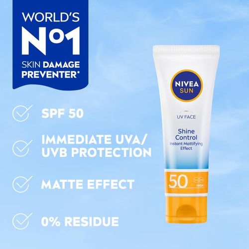 NIVEA SUN UV Face Shine Control SPF 50 is especially developed for delicate facial skin. Formula with Ultra Spectrum Proection provides immediate protection against UVA & UVB induced skin damage as well as from High Energy Visible Lights effects such as premature skin aging.